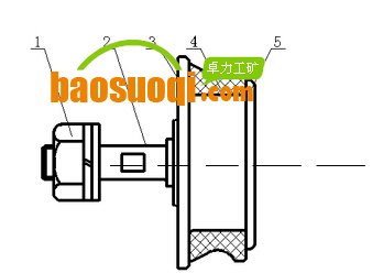 2.3 托繩輪(圖5) 托繩輪由緊固件1、軸2、輪體3、輪襯4、輪蓋5組成。輪體是鑄鐵材料制造,輪襯是索道專用耐磨材料制造的。