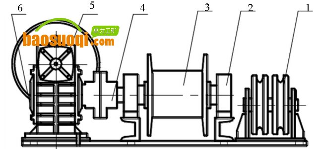 4.1 張緊絞車(圖8) 張緊絞車主要由雙滑輪1、軸承座2、卷筒3、聯軸器4、手輪5、減速器6組成 ,張緊絞車隨時調節行程,防止重錘落地和沖頂。